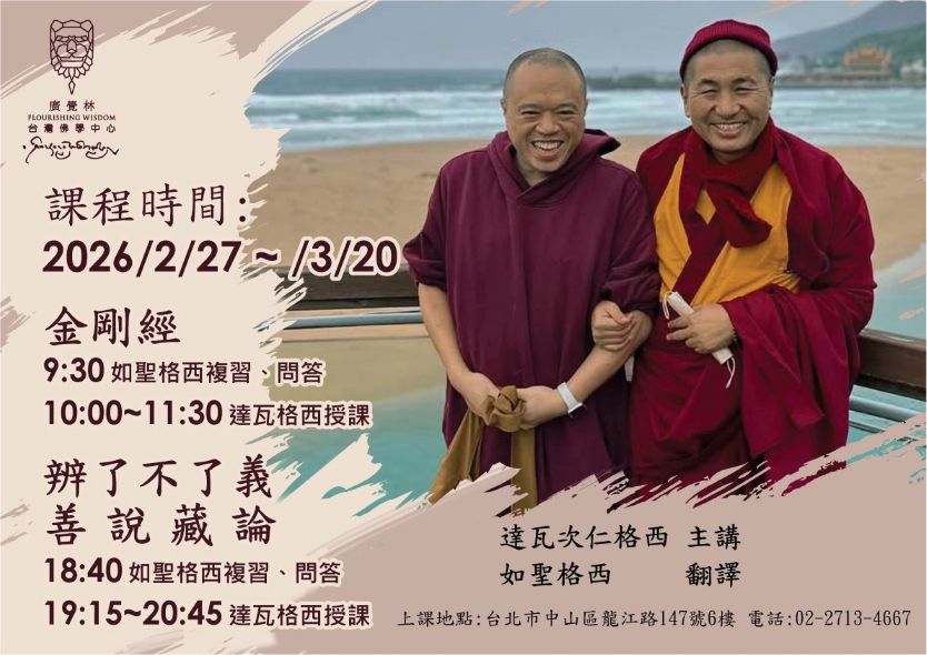 今年(2026)課程上午將講授,晚上則接續去年課程講授宗喀巴大師《辨了不了義善說藏論》。