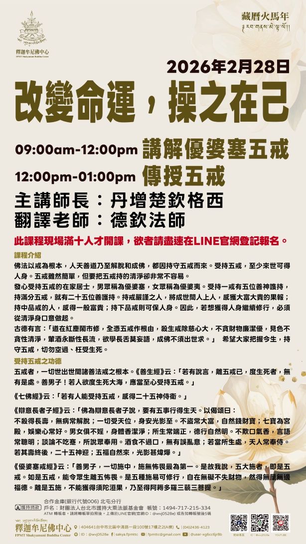 古德有言:「道在紅塵開市修,全憑五戒作根由,殺生戒除慈心大,不貪財物廉潔優,見色不貪性清淨,葷酒永斷性長流,欲學長舌莫妄語,成佛不須出世求。」希望大家把握今生,持守五戒,切勿空過、枉受生死。