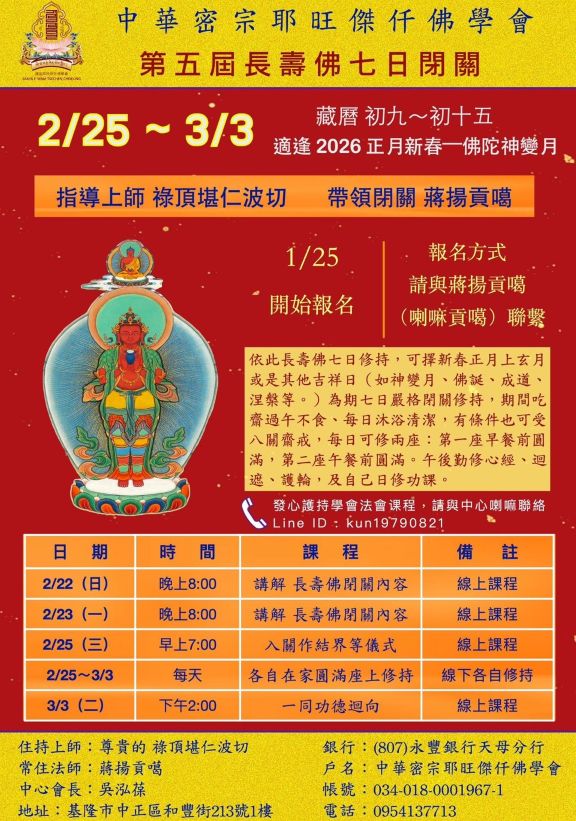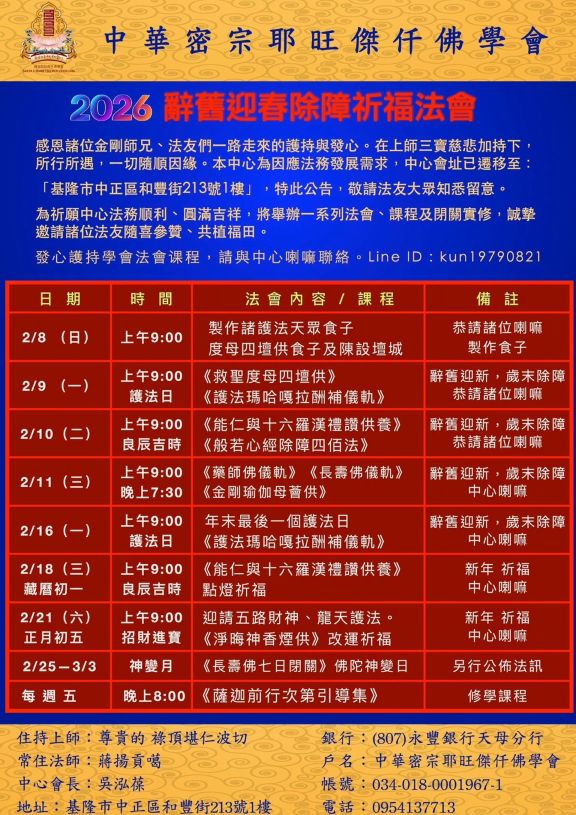 辭舊迎春除障祈福法會 主法上師:喇嘛蔣揚貢噶 薩迦 法會 2026/02/18~2026/03/03 喇嘛 蔣揚貢噶 中華密宗耶旺傑仟佛學會 辭舊迎春除障祈福法會 感恩諸位金剛師兄、法友們一路走來的護持與發心。在上師三寶慈悲加持下,所行所遇,一切隨順因緣。本中心為因應法務發展需求,中心會址已遷移至: 「基隆市中正區和豐街213號1樓」,特此公告,敬请各位金刚法友们悉知留意。 為祈願中心法務事業,圆满顺利,将举办一系列法會、實修闭关等课程,誠摯邀請諸位法友隨喜參贊、共植福田。 友善列印 上一篇:新春白財神寶瓶勾招增益法會 下一篇:藏曆神變月.山淨煙供暨施放風馬法會 精選法訊 孔雀山祖庭開成禪寺新春祈福法會 2026/02/17~2026/02/20 顯教 法會 2026 佐欽【新年招財納福法會】 2026/02/17~2026/02/22 寧瑪 法會 煙供.白度母長壽法會&迎財神 2026/02/17~2026/02/21 薩迦 法會 115年新春護國梁皇齊天大法會 2026/02/17~2026/02/25 顯教 法會 藏暦火馬年新春團拜&無等妙香廣大煙供 2026/02/17~2026/02/19 格魯 法會 普陀禪林-丙午新春祈福光明法會 2026/02/17~2026/02/27 顯教 法會 2/17~頂髻尊勝佛母長壽法會 2026/02/17~2026/03/05 格魯 法會 2/17南印~吉祥天母暨護法總集永夜法會 2026/02/17~2026/03/05 格魯 法會 喇嘛網| Facebook 全球慈悲智慧數位佛學院 全球藏傳佛教最新弘法訊息﹝ Google全球第一資訊同步 ﹞