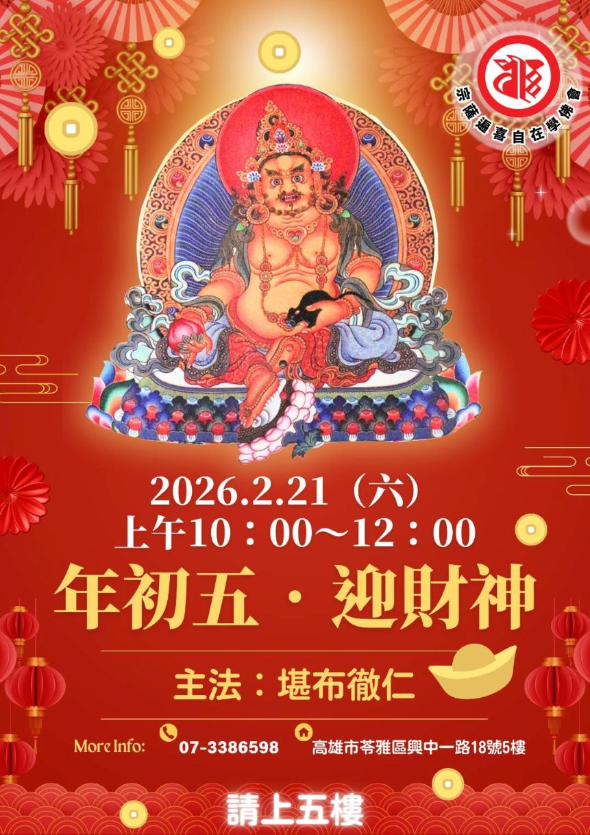 大年初五迎財神 主法上師:堪布徹仁 薩迦 法會 2026/02/21 堪布徹仁 2/21(六) 大年初五 迎財神 請茹素 宗薩遍喜自在學佛會 高雄市苓雅區興中一路18號5樓 電話:07-3386598、0978-590049 友善列印 上一篇:印度上密院(神變月)祈願大法會 精選法訊 2/19 新春~桑煙供養法會 2026/02/19~2026/03/06 格魯 法會 印度上密院(神變月)祈願大法會 2026/02/19~2026/02/25 格魯 法會 2026 願望任運蓮師十三本尊灌頂法會 2026/02/20~2026/02/22 寧瑪 灌頂 新春蓮師財神祈福暨蓮師總集煙供法會 2026/02/20 噶舉 法會 僧伽長照-115年新春祈福法會 2026/02/20~2026/02/24 顯教 法會 經續法林新春祈福活動 2026/02/20~2026/03/03 格魯 法會 晨起禪修 2026/02/20~2026/02/26 格魯 課程 度母除障消災安太歲大法會 2026/02/20 噶舉 法會 喇嘛網| Facebook 全球慈悲智慧數位佛學院 全球藏傳佛教最新弘法訊息﹝ Google全球第一資訊同步 ﹞