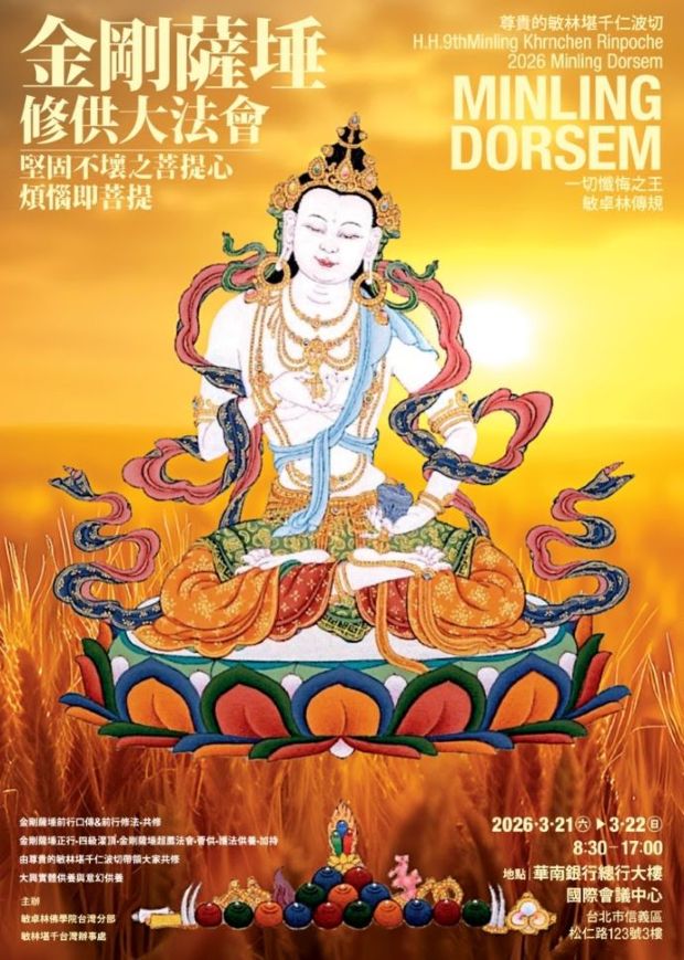 重磅法筵_金剛薩埵修供大法會 主法上師:尊貴敏林堪千仁波切 寧瑪 法會 2026/03/21~2026/03/22 尊貴敏林堪千仁波切 主法上師:尊貴的敏林堪千仁波切 時間:2026.3.21(六)-3.22(日)8:30 -17:00 地點:華南銀行總行大樓會議中心|台北市信義區松仁路123號3樓 主辦單位:敏卓林佛學院台灣分部—敏林堪千台灣辦事處 (達瑪師利居士林) 報名表單| https://forms.gle/kGUsRU4E5PA8jRK56 相關資訊 友善列印 上一篇:喇榮開顯光明佛學會-蓮師總集財神招財法會 下一篇:3/10南印~密集金剛自入壇城4天大法會 精選法訊 經續法林喇嘛梭巴仁波切示寂三週年紀念法會 2026/04/13 格魯 法會 宗喀巴大師著:《功德之本》 2026/04/13~2026/06/01 格魯 課程 孔雀明王 啟建梁皇寶懺法會 2026/04/15~2026/04/19 顯教 法會 噶千佛學會2026年四月線上共修 2026/04/17~2026/04/24 噶舉 共修 尊貴的 第42任薩迦法王來台福慧行 2026/04/18~2026/05/04 薩迦 法會 煙供法會 2026/04/18 格魯 法會 上密院大經教師挪桑仁波切來台弘法行程 2026/04/19~2026/06/02 格魯 灌頂 4/26 吉祥天母暨護法酬懺薈供除障法會 2026/04/26~2026/05/10 格魯 法會 喇嘛網| Facebook 全球慈悲智慧數位佛學院 全球藏傳佛教最新弘法訊息﹝ Google全球第一資訊同步 ﹞