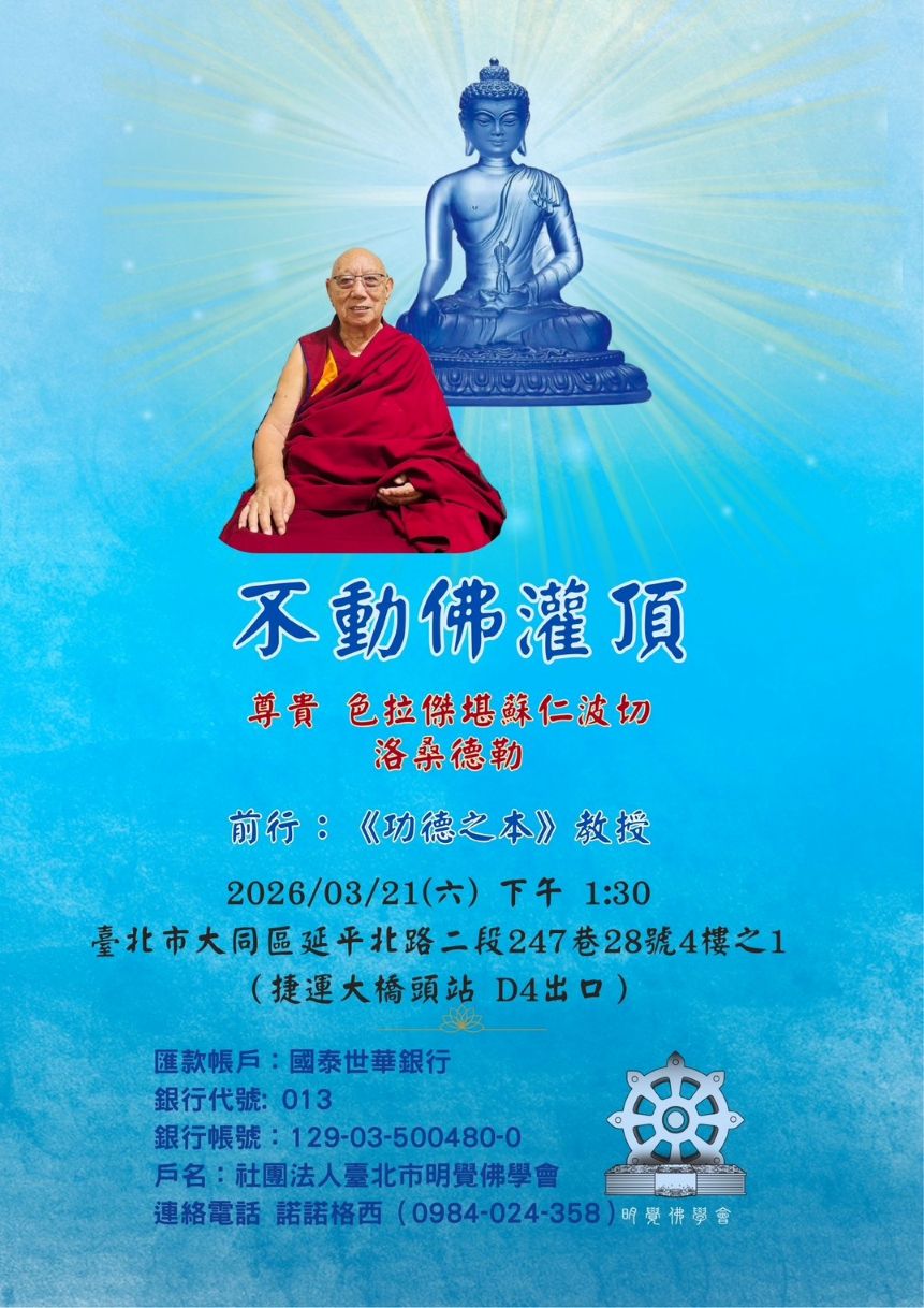 不動佛灌頂&忿怒三尊灌頂 主法上師:尊貴 色拉傑堪蘇仁波切 洛桑德勒 格魯 灌頂 2026/03/21~2026/03/22 尊貴洛桑德勒仁波切 不動佛灌頂&忿怒三尊灌頂 尊貴 色拉傑堪蘇仁波切 洛桑德勒 2026/03/21(六)下午1:30 不動佛灌頂 2026/03/22(日)下午1:30 忿怒三尊灌頂 臺北市大同區延平北路二段247巷28號4樓之1 (捷運大橋頭站 D4出口) 社團法人臺北市明覺佛學會 連絡電話 諾諾格西(0984-024-358) 友善列印 上一篇:經續法林3月課程表 下一篇:八大法行灌頂&耶喜嘉措隨喜 精選法訊 聽即解脫 — 十萬道歌誦持法會 2026/03/01~2026/03/03 噶舉 法會 宗薩遍喜自在學佛會3月法訊 2026/03/01~2026/03/31 薩迦 法會 嘎桑仁波切成就大圓滿涅槃荼毘火供大法會 2026/03/02 寧瑪 法會 2026頂尊勝佛母千供大法會 2026/03/02~2026/03/03 薩迦 法會 經續法林3月課程表 2026/03/02~2026/03/31 格魯 法會 八大法行灌頂&耶喜嘉措隨喜 2026/03/02~2026/03/18 格魯 灌頂 佛陀神變日白瑪哈嘎拉修法 2026/03/03 覺囊 法會 薩迦大智佛學會3–4月法訊 2026/03/03~2026/04/04 薩迦 法會 喇嘛網| Facebook 全球慈悲智慧數位佛學院 全球藏傳佛教最新弘法訊息﹝ Google全球第一資訊同步 ﹞