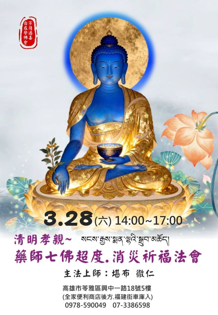 清明孝親 藥師七佛超度.消災祈福法會 主法上師:徹仁堪布 薩迦 法會 2026/03/28 堪布徹仁 清明孝親 藥師七佛超度.消災祈福法會 法會時間:3.28(六)14:00-17:00 報名/詳情 https://reurl.cc/k84aDd ✅ 請茹素 ✅ 無法參加的法友,亦歡迎報名。 ✅ 護持隨喜 友善列印 上一篇:《修心八頌》 略釋 下一篇:「和平共榮,向上向善渡馬年」 和平講座 精選法訊 薩迦大智佛學會3–4月法訊 2026/03/03~2026/04/04 薩迦 法會 2026年不丹聖地祈福.消災供僧超薦大法會 2026/03/04~2026/04/01 噶舉 法會 《修心八頌》 略釋 2026/03/05 格魯 教學 吉祥天母灌頂&閉關 2026/03/07~2026/03/19 格魯 閉關 2026西藏瑜伽與靜坐 2026/03/07 格魯 修行 財寶天王隨許法會暨供養財寶天王寶瓶法訊 2026/03/08 格魯 法會 佛光山禪淨共修獻燈祈福法會 2026/03/08 顯教 法會 2026 明就仁波切台灣弘法行程 2026/03/10~2026/07/04 噶舉 法會 喇嘛網| Facebook 全球慈悲智慧數位佛學院 全球藏傳佛教最新弘法訊息﹝ Google全球第一資訊同步 ﹞