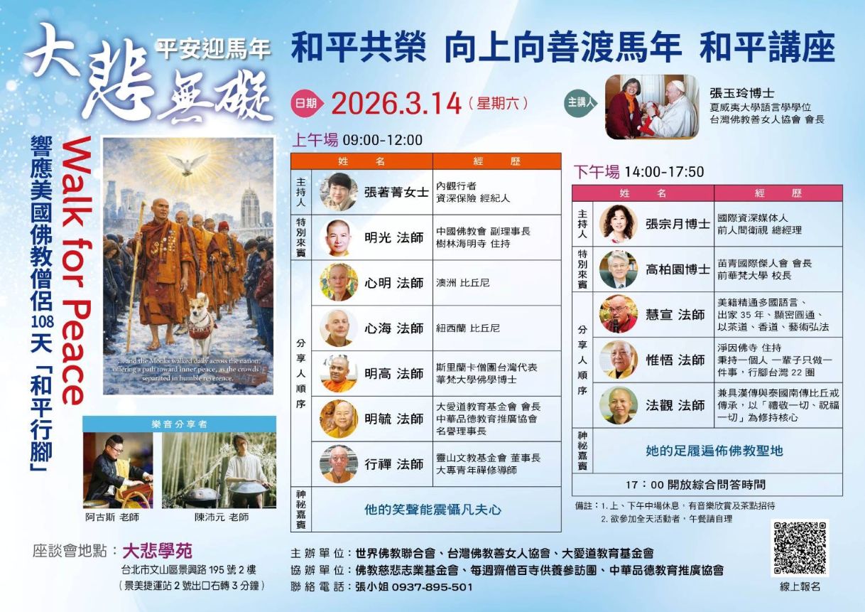 「和平共榮,向上向善渡馬年」 和平講座 利美 演講 2026/03/14 〝和平共榮,向上向善渡馬年〞和平講座 美國佛教僧侶Walk for Peace和平行腳,108天之迴響 時間:3月14日(六) 上午場 09:00〜12:00 下午場 14:00〜17:30 地點:大悲學苑 台北市文山區景興路195号2楼 (景美捷運站2號出口) 報名:https://forms.gle/qeBeRoq8vGaTWrQv6 友善列印 上一篇:清明孝親 藥師七佛超度.消災祈福法會 下一篇:2026年不丹聖地祈福.消災供僧超薦大法會 精選法訊 薩迦大智佛學會3–4月法訊 2026/03/03~2026/04/04 薩迦 法會 2026年不丹聖地祈福.消災供僧超薦大法會 2026/03/04~2026/04/01 噶舉 法會 《修心八頌》 略釋 2026/03/05 格魯 教學 吉祥天母灌頂&閉關 2026/03/07~2026/03/19 格魯 閉關 2026西藏瑜伽與靜坐 2026/03/07 格魯 修行 財寶天王隨許法會暨供養財寶天王寶瓶法訊 2026/03/08 格魯 法會 佛光山禪淨共修獻燈祈福法會 2026/03/08 顯教 法會 2026 明就仁波切台灣弘法行程 2026/03/10~2026/07/04 噶舉 法會 喇嘛網| Facebook 全球慈悲智慧數位佛學院 全球藏傳佛教最新弘法訊息﹝ Google全球第一資訊同步 ﹞