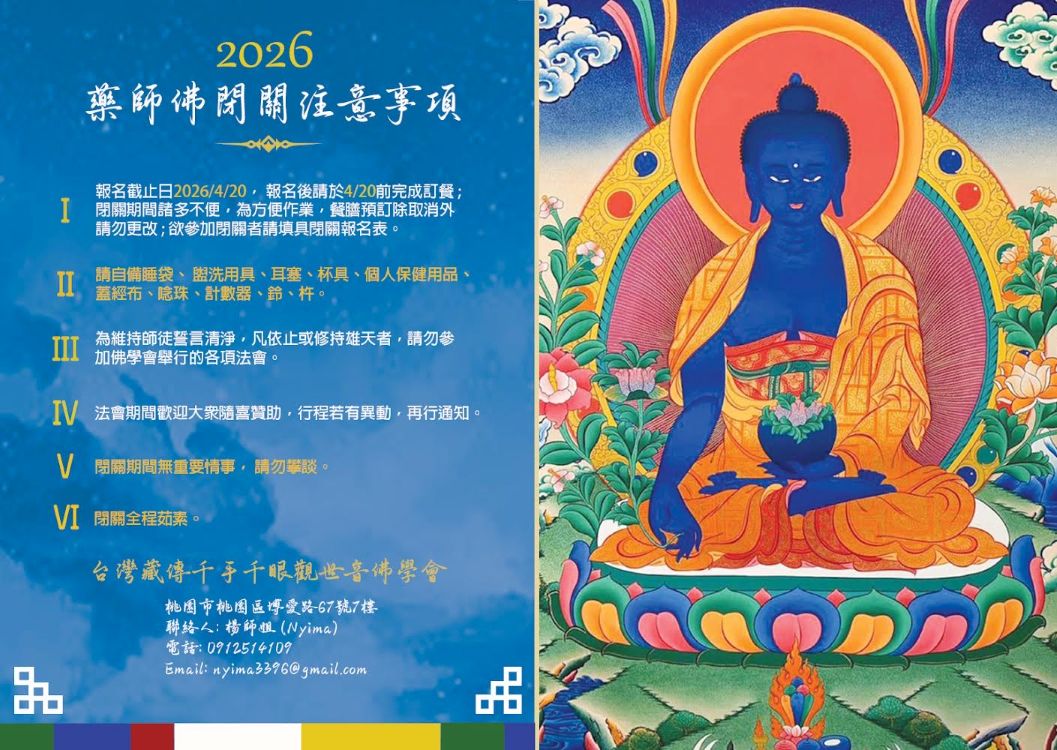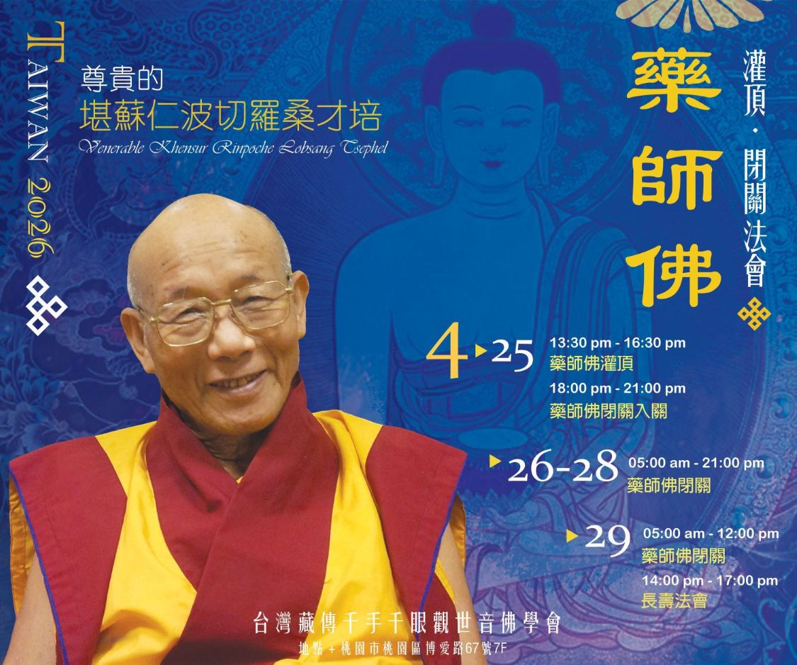 2026年度藥師佛閉關及堪蘇仁波切長壽法會 主法上師:堪蘇仁波切羅桑才培 格魯 灌頂 2026/04/25~2026/04/29 尊貴羅桑才培堪仁波切 2026年度藥師佛閉關及堪蘇仁波切長壽法會 友善列印 上一篇:4/26 滿願煙供暨夏尊達浪瑪心意法祈福 精選法訊 尊貴的 第42任薩迦法王來台福慧行 2026/04/18~2026/05/04 薩迦 法會 色拉傑寺院扎西切塔堪仁波切弘法行程 2026/04/18~2026/04/22 格魯 灌頂 斷法.空行笑聲儀軌唱誦與法器使用法教學 2026/04/18~2026/04/25 寧瑪 教學 週日共修-台北市祇園佛學會 2026/04/19~2026/04/26 噶舉 共修 上密院大經教師挪桑仁波切來台弘法行程 2026/04/19~2026/06/02 格魯 灌頂 台北市大乘林佛學會口傳法訊 2026/04/19 格魯 修行 4/26 滿願煙供暨夏尊達浪瑪心意法祈福 2026/04/19~2026/04/26 噶舉 法會 2026年度藥師佛閉關及堪蘇仁波切長壽法會 2026/04/25~2026/04/29 格魯 灌頂 喇嘛網| Facebook 全球慈悲智慧數位佛學院 全球藏傳佛教最新弘法訊息﹝ Google全球第一資訊同步 ﹞
