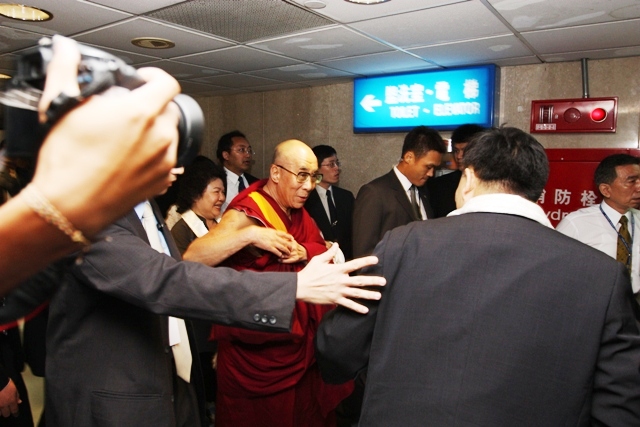 達賴昨晚近十一點抵達桃園機場,他表示希望親自看到災民,為他們祈福。他在出發前也發表三點聲明,指此行是應台灣人民邀請,非任何政治團體;除安撫災民和超度亡靈外,純為台灣人民祈福消災,無任何其他因素考量。