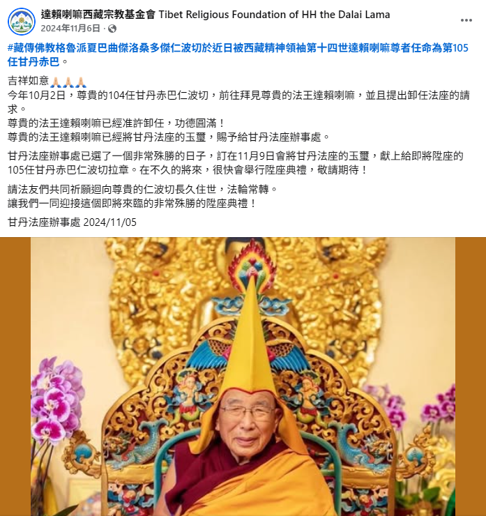 夏巴曲傑洛桑多傑仁波切被西藏精神領袖第十四世達賴喇嘛尊者任命為第105任甘丹赤巴
