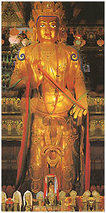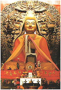 供奉著格魯派創始人宗喀巴大師銅像一尊,兩旁陳列著十四世達賴喇嘛,十世班禪大師的講經寶座。達賴和班禪,是格魯派最為顯赫的兩位大活佛,是宗喀巴在世時,八大弟子中的兩位。一個叫根敦•珠巴,一個叫凱珠。他們圓寂後,按活佛轉世制度往下傳承,在第五代〈也稱第五世〉,相繼被清順治帝和康熙帝冊封為達賴和班禪。達賴意為道德深廣,無所不能。班禪意為大智大勇。根敦•珠巴為一世達賴,凱珠是一世班禪。